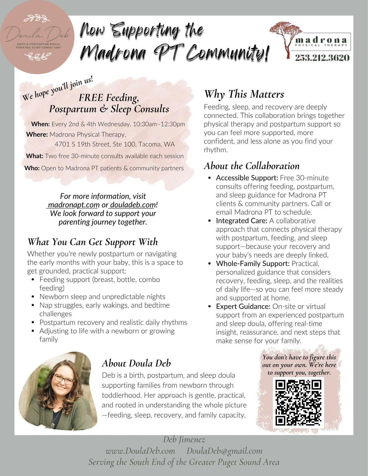 Accessible Support: Free, 30-minute consults offering feeding, postpartum, and sleep guidance for Madrona PT clients and community members. You get up to 2 complimentary sessions with her just for having been to Madrona. Call or e-mail Madrona PT to schedule.